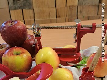 Wir schauen uns Äpfel nicht nur von innen an, wir essen sie auch! Und testen, bis wir unsere Lieblingssorte gefunden haben. Aus dem ganzen Sortiment pressen wir Apfelsaft und mit ein paar Apfelscheiben bedrucken wir dann schöne Geschirrtücher. Vielleicht singen wir auch,,,