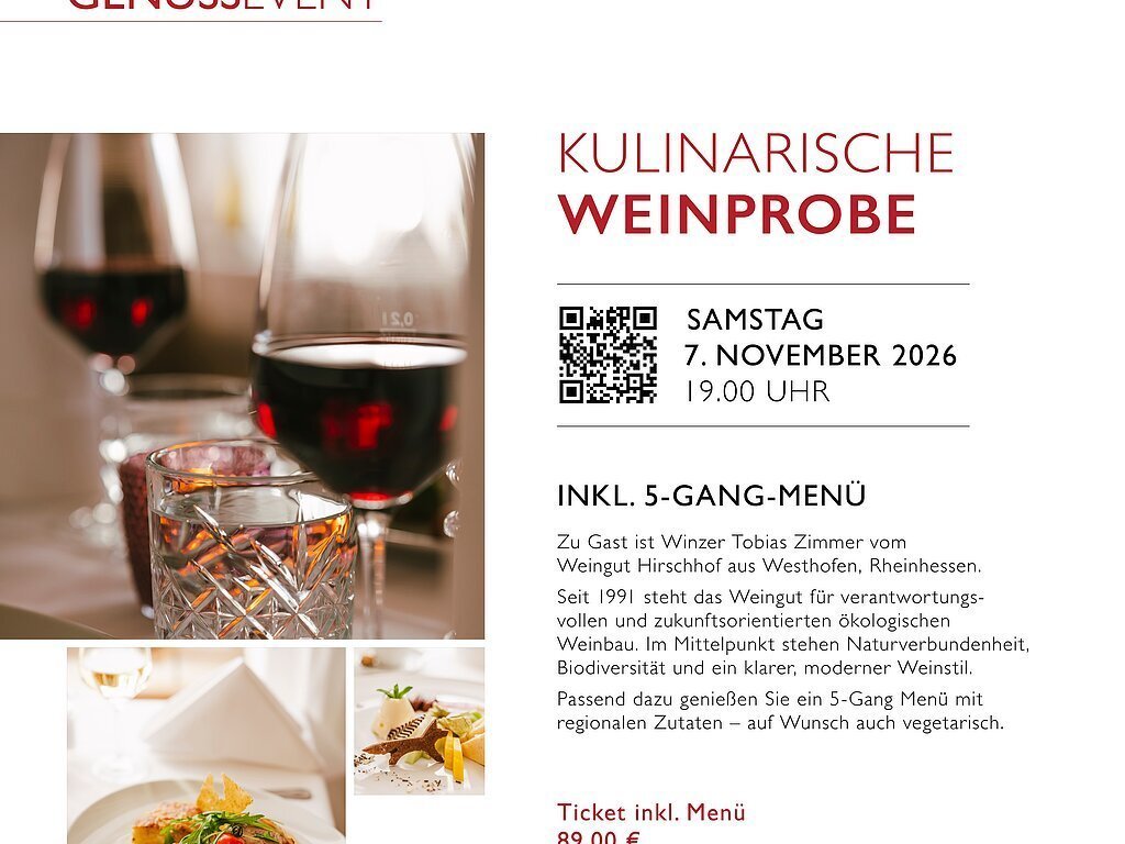 KULINARISCHE WEIN PROBE IM FUCHSBRÄU Zu Gast ist Winzer Tobias Zimmer vom Bio Weingut Hirschhof aus Westhofen. Seit 1991 steht das Weingut für verantwortungsvollen und zukunftsorientierten ökologischen Weinbau. Im Mittelpunkt stehen Naturverbundenheit, Biodiversität und ein klarer, moderner Weinstil. Dazu serviert Ihnen unser Küchenteam ein 5-Gang-Menü mit ausgewählten heimischen Produkten – auf Wunsch auch vegetarisch. Preis p. P. 89,00 Euro Sonderpreis inkl. Übernachtung ab 139,00 Euro p.P. im Doppelzimmer 30,- € EZ-Zuschlag